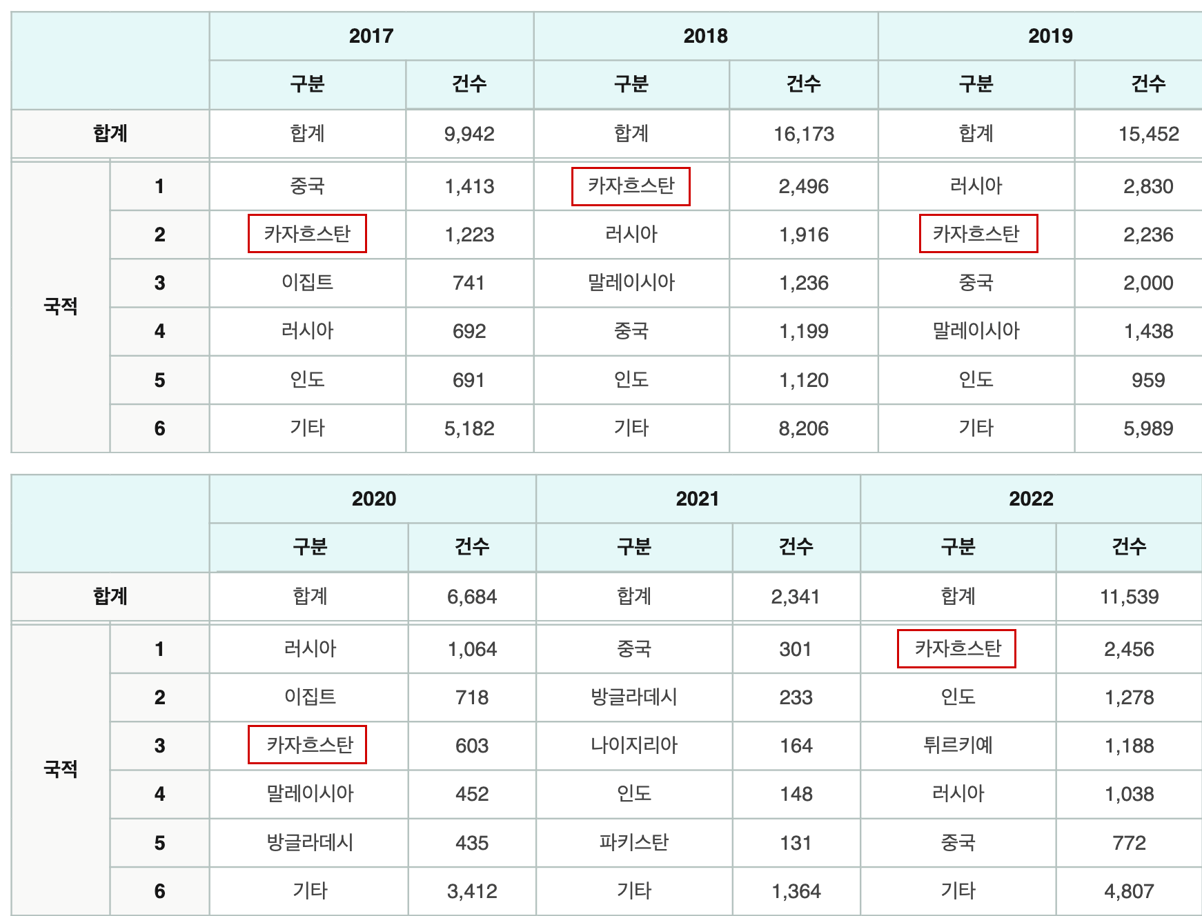 한편 2022년에는 2천 456건의 난민 신청으로 국적별 신청 건수 통계에서 전체 1위를 기록했던 카자흐스탄 국적자들의 경우 2023년에는 총 2천 94명으로 집계되어 러시아인들에 이어 2위를 차지했다. 카자흐스탄과 러시아는 지난 수년간 번갈아 가며 한국 내 난민 신청자 수에서 1·2위를 포함해 꾸준히 상위권에 자리잡아 온 바 있다. 또한 1994년에서 2019년에 이르는 기간 동안 누적된 총 6만 4천 358명의 난민 신청자 중에서도 카자흐스탄 국적자들은 중국(6,840명)에 이어 6,542명으로 전체 2위를 기록했다. 한편 지난 해 러시아와 카자흐스탄에 이어 한국 정부에 가장 많이 난민·망명 신청을 한 국적자들은 중국인(1천282명), 말레이시아인(1천205명), 인도인(1천189명) 순으로 나타났다.