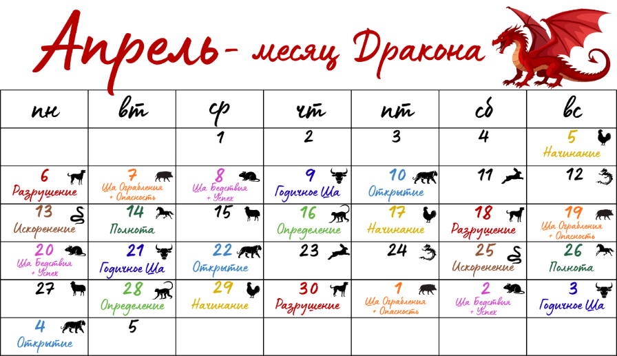 Дни «Успеха» – 8, 20 апреля, 2 мая. Хотя эти дни считаются благоприятными и позитивными, в месяц Дракона на эти даты выпадает день «Ша» – бедствие. Поэтому возможны недомогания и телесные заболевания.