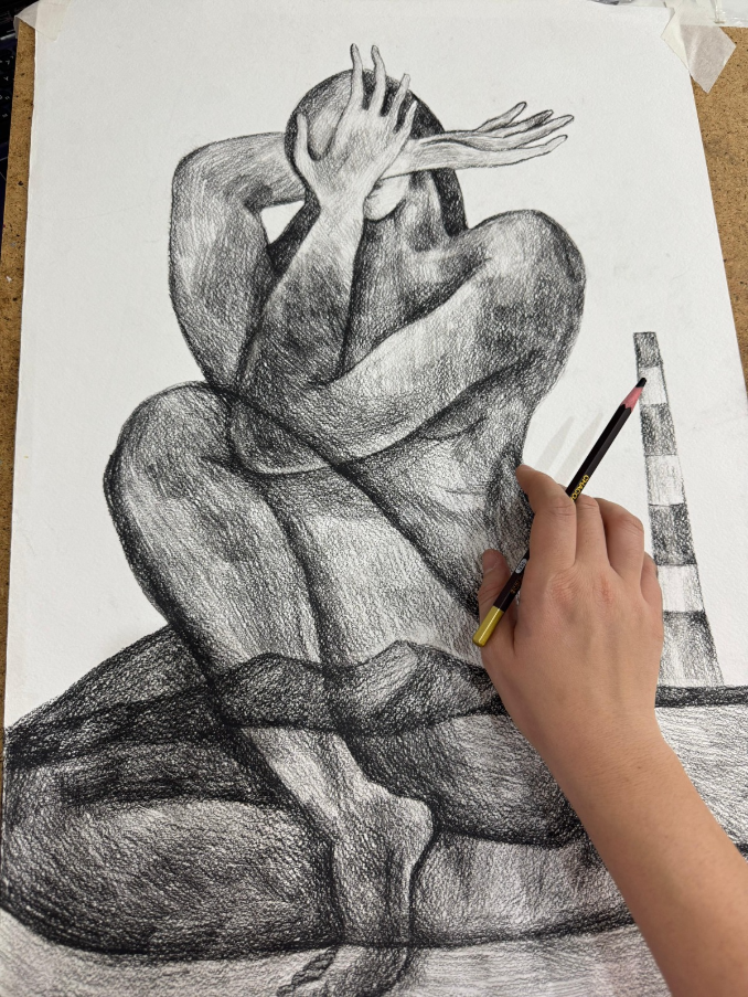 – Меня вдохновляют темы женственности, материнства, свободы и среды, в которой мы живём. На последней работе я изобразила женщину, которая хочет оградить своего ребёнка от грязного воздуха. Но не может найти альтернативу. Раньше внутри себя она могла ему помочь, но с первым вздохом ребёнок становится уязвим. В готовой работе на заднем плане показан дым, выбрасываемый трубами ТЭЦ и частными домами, – рассказывает художница.