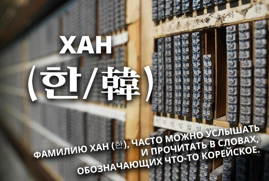 Фамилию Хан (한) часто можно услышать и прочитать в словах, обозначающих что-то корейское. Например: Корея 한국/韓國, корейская кухня 한식/韓國料理, ханок (корейский дом) 한옥/韓屋, корейская письменность 한글/ 韩文, Корейский полуостров 한반도/韓半島.