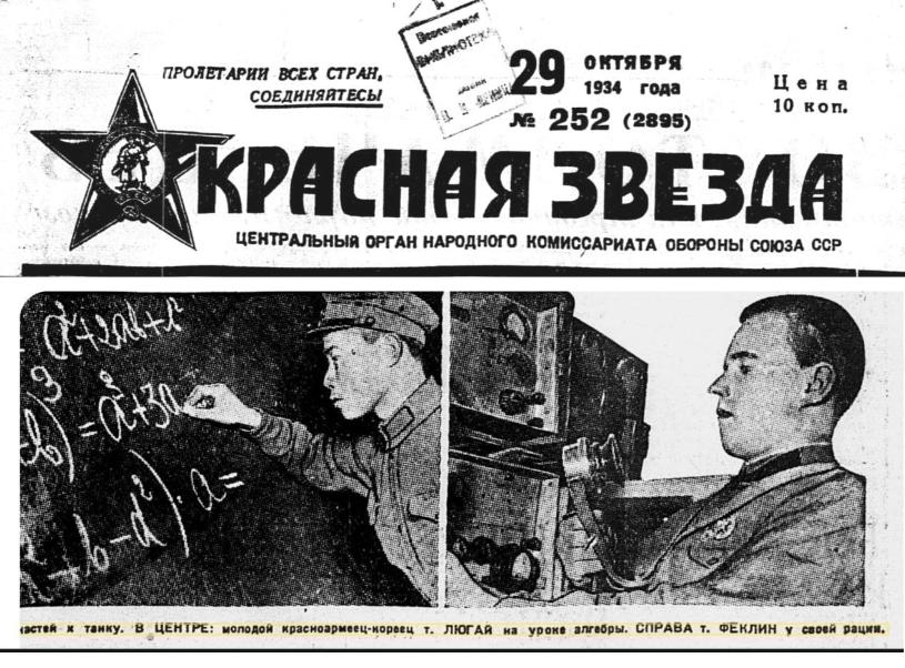 В номере газеты «Красная звезда» от 29 октября 1934 года опубликован снимок двадцатилетнего корейца Люгая, будущего танкиста. На фотографии он выводит на доске алгебраические формулы. Надо сказать, что танковые войска в 1934 году – новейший род вооружённых сил, и войска считались элитными. Фотография на первой полосе не только показывает возможности, которые открывала советская система образования, но и полное доверие национальным кадрам в военно-технических программах.