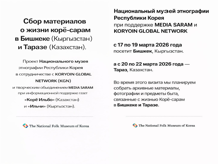 Национальный музей этнографии Республики Корея продолжает международный проект по сбору материалов о жизни корё сарам. В марте 2026 года исследовательская экспедиция посетит Бишкек (Кыргызстан) и Тараз (Казахстан), чтобы собрать свидетельства истории и повседневной жизни корейской диаспоры.