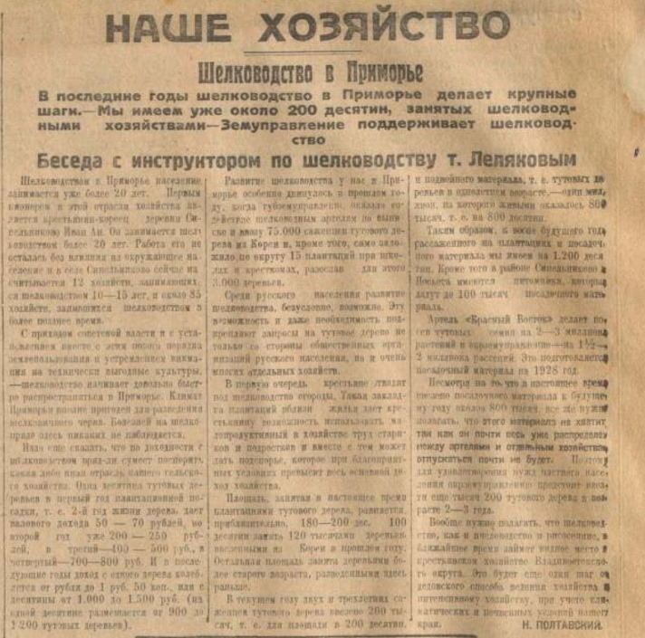 В книге «Корейцы в Уссурийском крае» С. Аносов пишет, что в 1925 году в Приморье были заложены плантации шелковицы в 15 корейских селениях общим числом 3 тыс. тутовых саженцев. Организовано две шелководных артели в Никольск-Уссурийском уезде в 75 000 тутовых деревьев и Владивостокском уезде – в 1000 тутовых саженцев. Шелководной артелью «Красный Восток», организованной в 1926 г, заложен шелководный питомник более чем из 100 тыс. тутовых саженцев. В июле 1926 г. во Владивостокской газете «Красное знамя» вышло и интервью с инструктором по шелководству А. Леляковым, в котором отмечалось, что шелководству в Приморье, начавшемуся в корейском селе Синельниково, уже более 20 лет. По его словам, в 1926 г. шелководством занимались 12 артелей более чем с 10- летним стажем и около 85 хозяйств, с меньшим опытом шелководческого дела, ставшим самой доходной отраслью сельского хозяйства. В своей статье в журнале «Советское Приморье» А. Леляков привёл в качестве доказательства своих слов расчёты: «На один гектар высаживается от 900 до 1200 штамбовых деревьев тутовника. Таким образом, доход с плантации с гектара будет идти в таком порядке: 1-й год – 50-70 руб., 2-й год – 200-250 руб., 3-й год – 400-500 руб., 4-й год – 700-800 руб. и 5-й год около 1000 руб. Средняя же продолжительность возраста дерева, когда оно даёт максимум кормового материала, исчисляется в 12-15 лет. Что в среднем на гектар плантации даёт доход в 12-15 тысяч рублей за этот период. Это расчёт при штамбовой посадке дерева, которая практиковалась населением до настоящего времени. Теперь идёт закладка плантации кустарниковым деревом, которое даёт процентов на 20 большую доходность, и при сборе листьев требует меньше труда. Кроме того, вся плантация тутового дерева может использоваться под посев других культур. Пример показала корейская Ханбалайская шелководная артель в Суйфунском районе, где земля между рядами тутовых деревьев использовалась для выращивания бобов или сои.