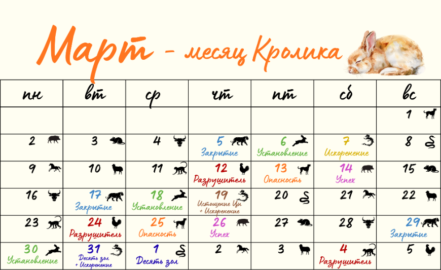 Месяц Кролика наступает 5 марта. Он ассоциируется с рассветом, весной и всеми ее радостями. В этот месяц наступает период весеннего равноденствия, и продлится Кролик до 5 апреля. Это время, когда надо выбросить все старое, изношенное и предстоит многое изменить. Всякому делу – свой день.