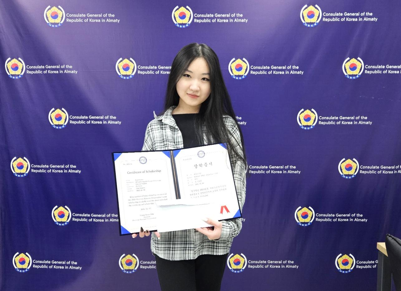 6 февраля в Генеральном консульстве Республики Корея в Алматы состоялась церемония вручения международной стипендии от Центра сотрудничества зарубежных корейцев. В числе награждённых была студентка 3-го курса кафедры Дальнего Востока (отделение корееведения) Казахского национального университета им. аль-Фараби Анжела Юн. Она была удостоена сертификата и стипендии в размере 1 200 долларов.
