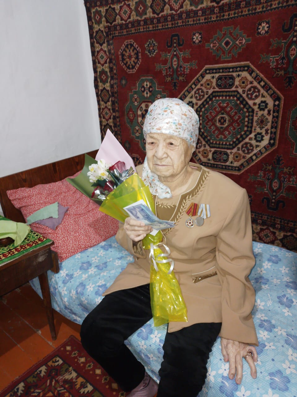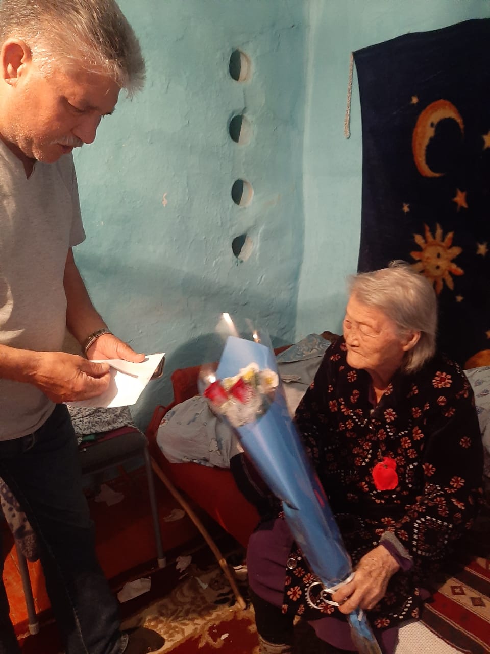 Далее активисты направилась дальше, чтобы поздравить ещё одну долгожительницу – Раису Михайловну Цай. Бабушке также вручили денежный подарок и букет цветов, а Никита Николаевич пожелал ей бодрости духа и долгих лет жизни.