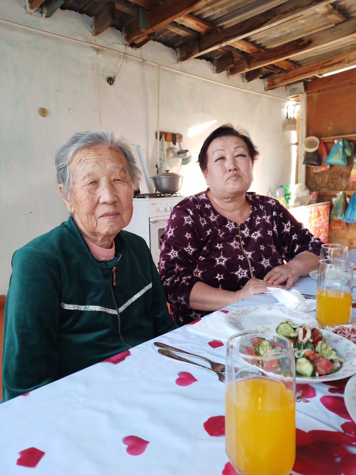Первым делом команда посетила Майю Васильевну Шин, проживающую в колхозе «Заря коммунизма». 1 мая ей исполнилось 92 года. Уроженка Приморского края, Майя Васильевна в 1937 году вместе с семьей была депортирована из приграничных районов Дальнего Востока в Казахстан. Вышла замуж в 1953 году за Виссариона Николаевича Цоя. Майя Васильевна удостоена звания «Мать-героиня», воспитала шестерых детей, у нее десять внуков и 15 правнуков. На протяжении всей жизни трудилась на разных производственных участках, долгое время вела активный образ жизни, была садоводом-любителем. За праздничным столом гостей встречали сыновья, дочери и зять, приехавшие поздравить маму с днём рождения.