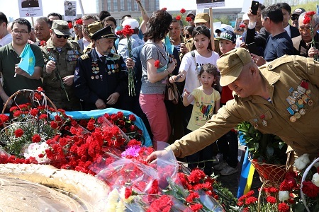 Началу шествия «Бессмертного полка» предшествовал автопробег, в котором народ увидел ретроавтомобили, солдат в камуфляжной форме, в гимнастерках, пилотках и бескозырках, с орденами и медалями, на капотах развевающиеся флаги и знамена. Красочные плакаты: «Смерть врагу», «Победа будет за нами!», «Враг будет разбит!», «Подвигу жить в веках», «Слава победителям!», «Слава труженикам тыла!», «Никто не забыт, ничто не забыто» и т.д. На площадь перед монументом защитникам Отечества вступают первые колонны. На транспарантах значатся «Казахстанцы - Герои Советского Союза», «Герои Советского Союза – акмолинцы». И всюду цветы, море цветов. Тысячи портретов, их несут родные участников войны, их седые дети, второе, третье поколения фронтовиков. Их фамилии безмолвно говорят о представителях разных наций, призванных из Казахстана на разгром врага. Казахи, русские, киргизы, белорусы, украинцы, татары, чуваши…, их много, отцов и дедов, когда-то сосланных людей на казахскую землю из прежних родных мест. Встречаются портреты девушек, женщин, молодых и красивых, чья молодость пришлась на медсанбаты, госпитали, а то и на боевое участие на передовых позициях.