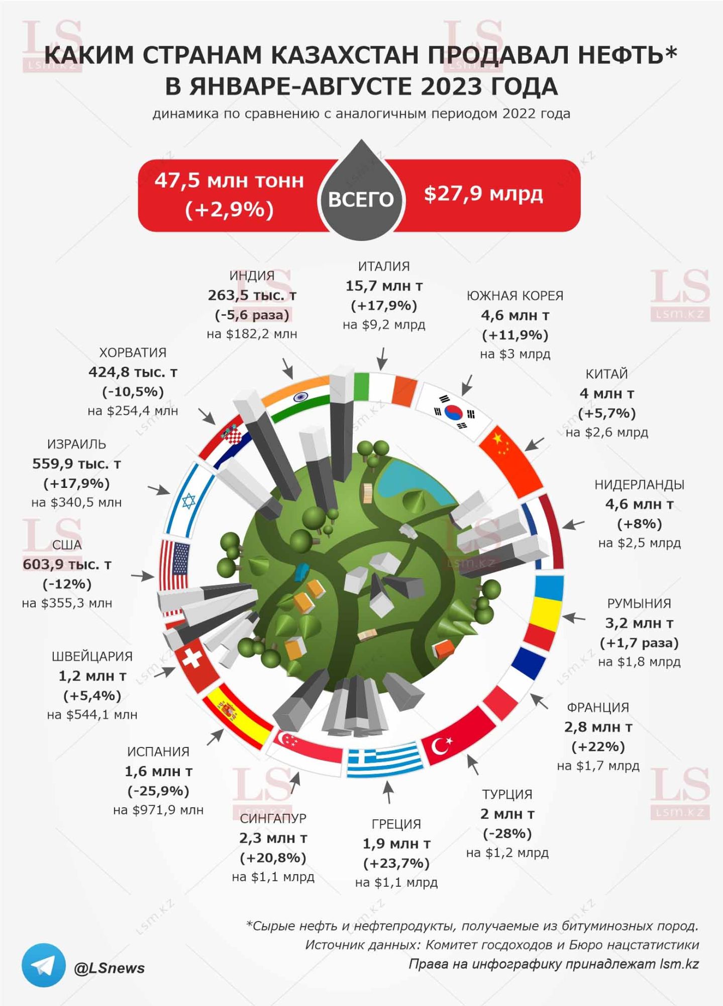 Больше всего нефти было отправлено в Италию – 15,7 млн тонн на 9,2 млрд долларов. Крупными покупателями также стали Южная Корея – 4,6 млн тонн на 3 млрд, Нидерланды – 4,6 млн тонн на 2,5 млрд, и Китай – 4 млн тонн на 2,6 млрд. Экспорт казахстанской нефти также увеличился в Румынию, Францию, Грецию, Сингапур, Швейцарию и Израиль. Однако по поставкам в некоторые страны заметно сокращение: в Индию – сразу в 5,6 раза, Турцию – на 28%, Испанию – на 25,9%, США – на 12%, Хорватию – на 10,5%. Нефть играет ключевую роль в экономике Казахстана, являясь одним из основных экспортных товаров страны. Казахстан обладает обширными запасами нефти, преимущественно сконцентрированными в западных регионах, таких как Каспийский бассейн, Кашаганское месторождение и другие. Это делает Казахстан одним из ведущих производителей и экспортёров нефти в мире.