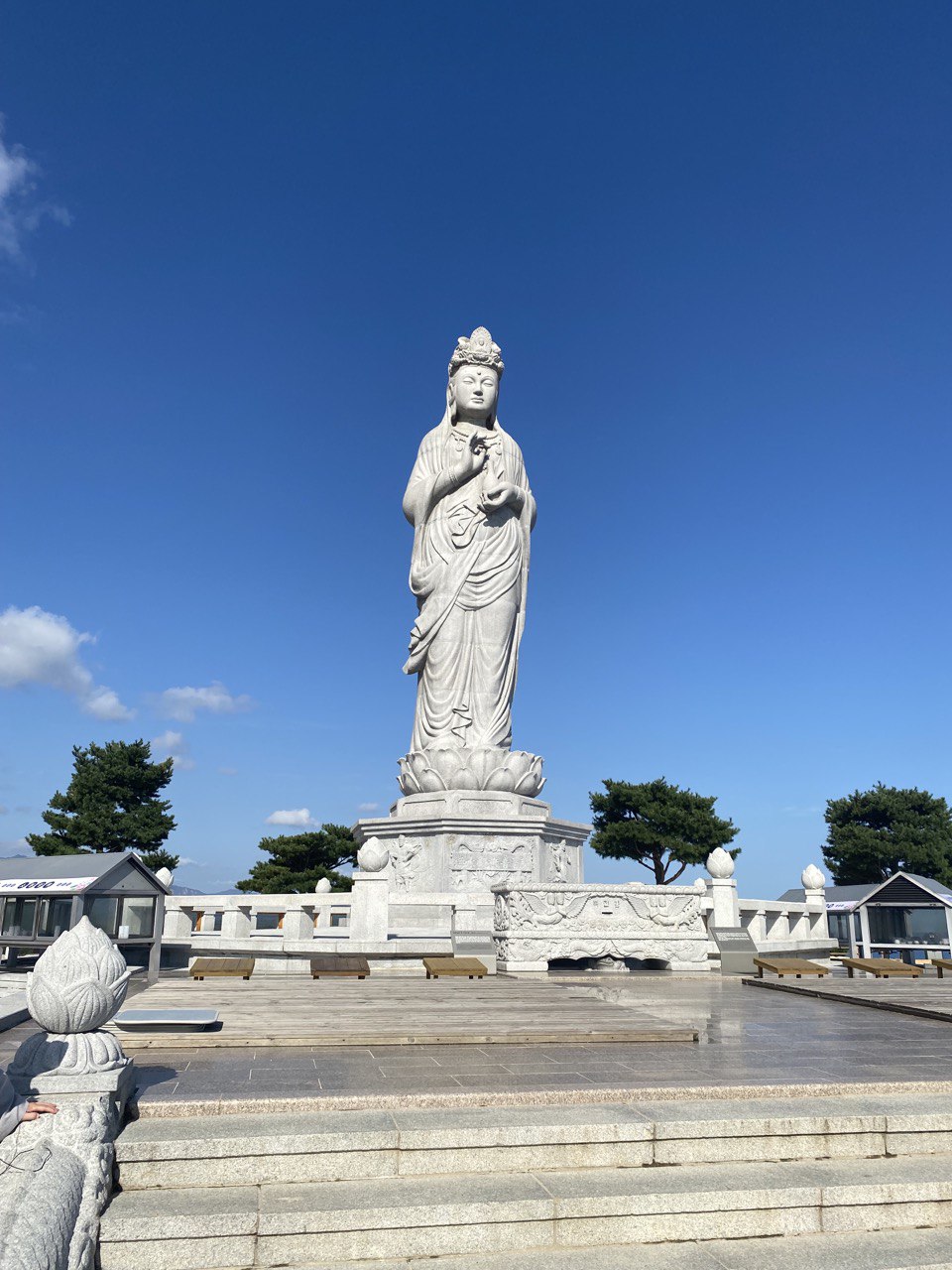 Путь к главному павильону лежит через трое главных ворот. Первые ворота называют воротами двойной радуги, поскольку арка выполнена из 14 камней – семь в два ряда. Согласно истории, каждый из этих камней был привезен из 26 округов древнего Чосона. Следующие ворота – ворота четырех стражников, которые защищают храм от плохих людей и духов. Выглядят они как человекоподобные демоны. Поскольку демоны в буддизме бывают как положительные, так и отрицательные, эти четыре стражника решили помогать Будде и не пропускать в храм «плохих парней». Поэтому, проходя через ворота, стоит отпустить негативные мысли и думать о чем-нибудь светлом. Рядом расположены четыре больших инструмента самуль, большой и малый колокола, большой барабан и инструмент в виде рыбы (!) – каждый из этих элементов покровительствует всем живущим на земле, над землей, в воде, и тем, кого больше нет в нашем мире. Последние ворота ведут прямиком к главному павильону, где сидит Бодхисттва Ава́локитешва́ра – Будда сострадания. Помимо громоздких статуй и храмов Наксанса славится исключительной природой и считается одним из восьми живописнейших мест на востоке Кореи. Самым захватывающим местом для нашей делегации, несомненно, стал скалистый берег, на вершине которого также расположен небольшой храм. Внутри можно помедитировать под звуки волн. Три дня в буддийском храме ощущались, как неделя в обыденной жизни. Возможно, лишь связь с внешним миром через смартфоны оставляла ощущение реальности и принадлежности к земле. Однако не медитации и буддийские службы отрывали от почвы, это все – природа. Территорию храма опоясывают кленовые и сосновые леса, примыкает он к скалистому берегу, откуда каждое утро обитатели храма встречают солнце. Под ногами мелкие волны разбиваются о скалы, а большие – разливаются и поглощают каменистую гору. Небо еще синее от ночи. Не каждый житель Южной Кореи видит горизонт, как мы – жители степей, не каждый видит горы, как мы – алматинцы. Мы же не видим моря, не чувствуем его запах, не пробирают нас его ветра.